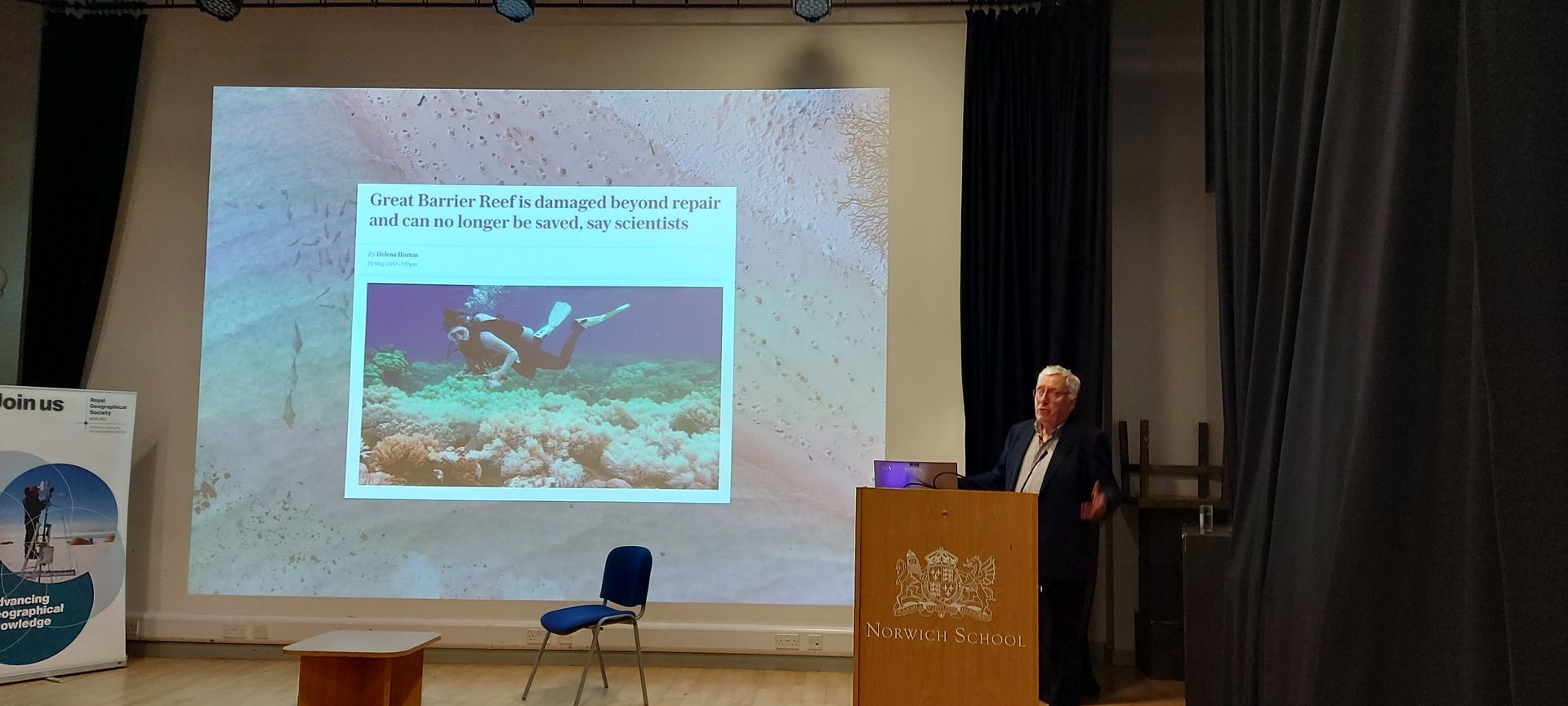The plight of the humble coral, one of the marvels of the natural world, has been under the spotlight at Norwich School. We are a host site of the eastern region of the prestigious Royal Geographical Society (RGS), and we are always delighted to welcome them to the Blake Studio. On 19 March 2025 we enjoyed an excellent evening in their company hearing their latest lecture entitled Coral Reefs: From Darwin to Doomsday.