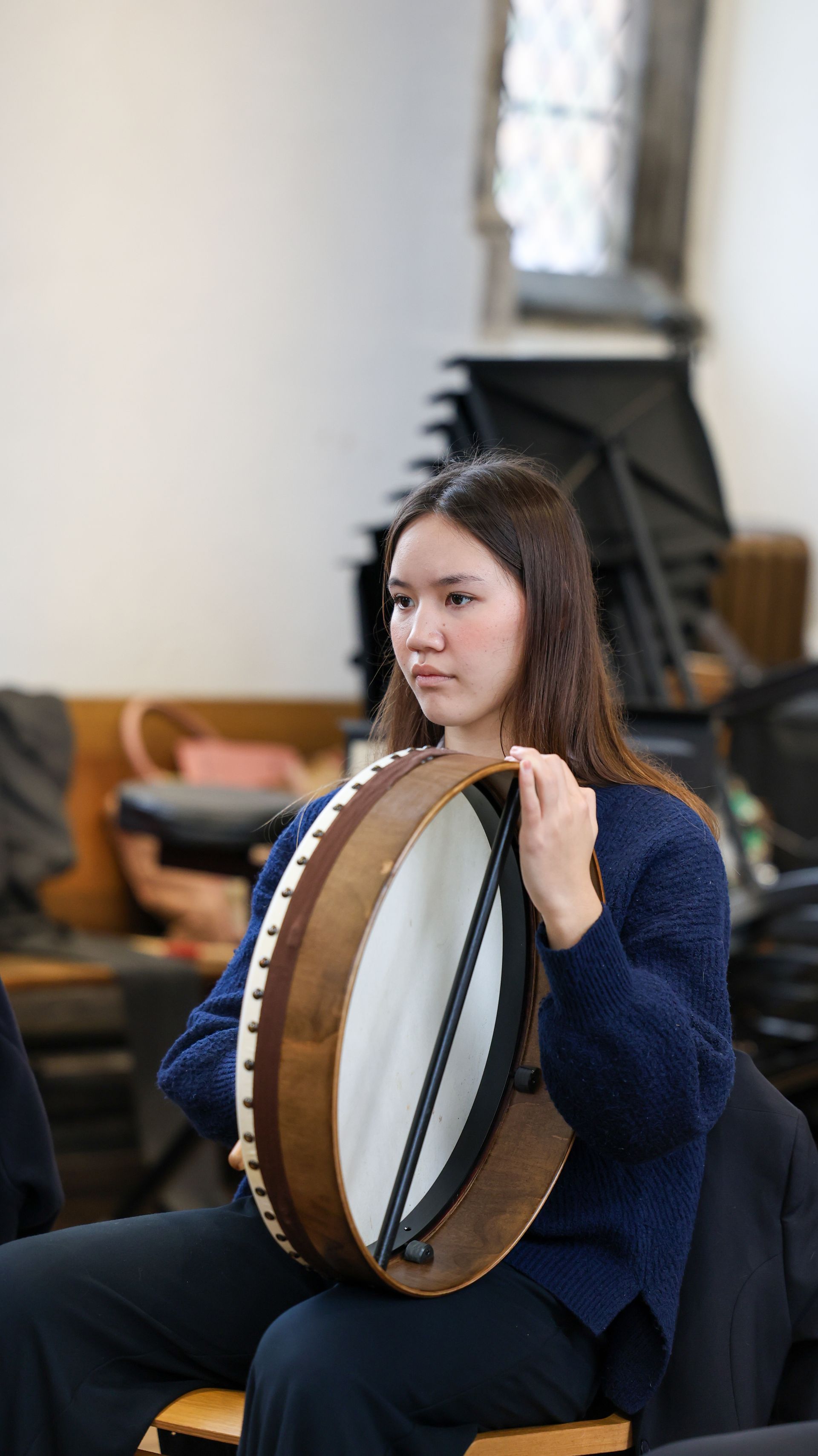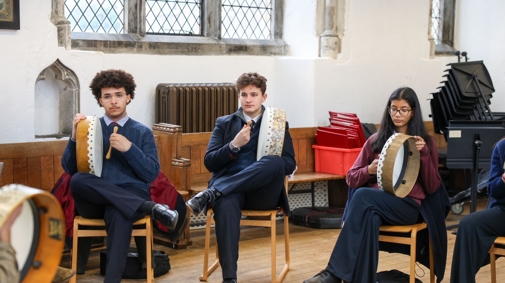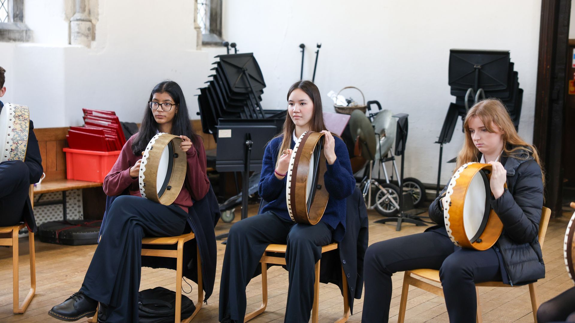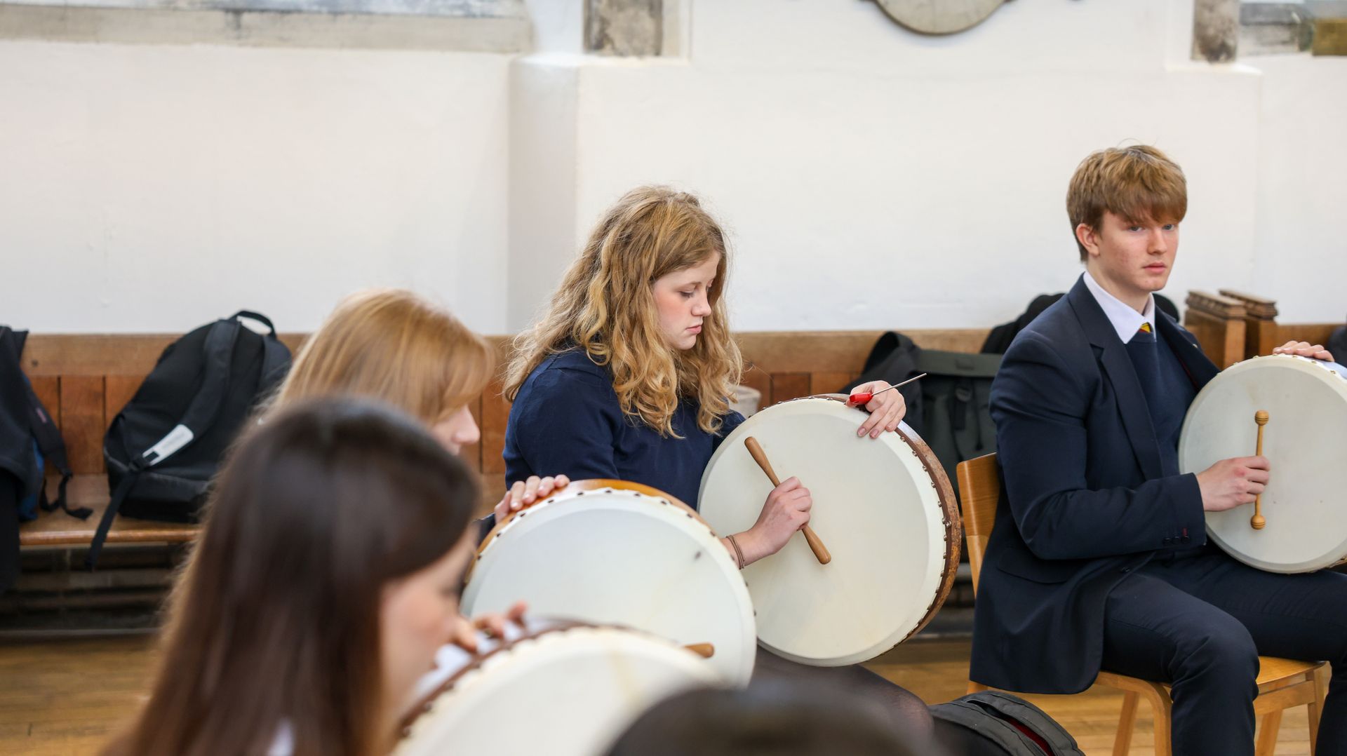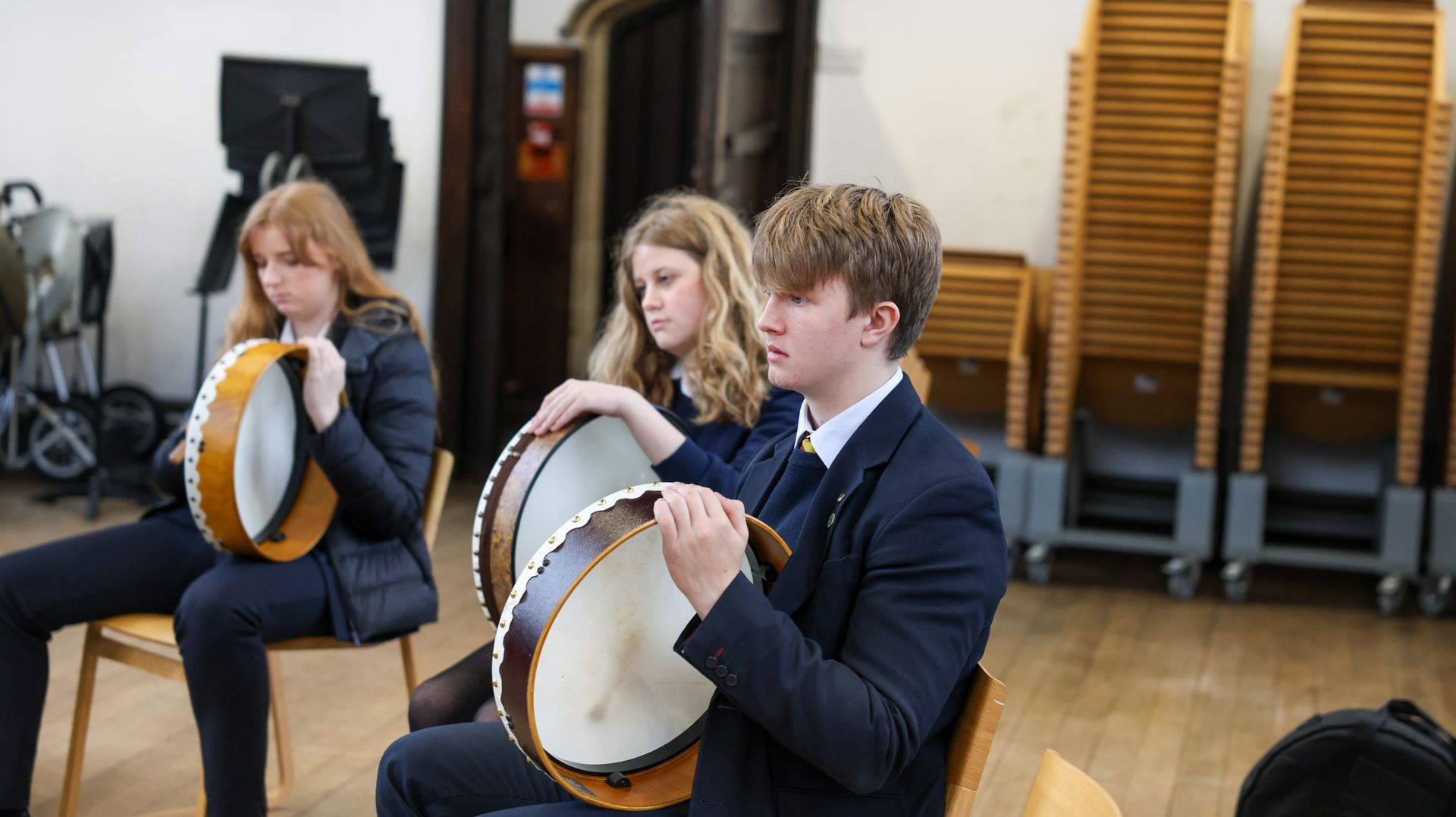 On Thursday 27 November, Music Scholars and Exhibitioners were invited to take part in a Bodhrán workshop led by Mark Moggy. They learnt the basic 'tipper' strokes, part of the Kerry technique. They also learnt how the drums are made and the background to how the Bodhrán became established in Irish music.