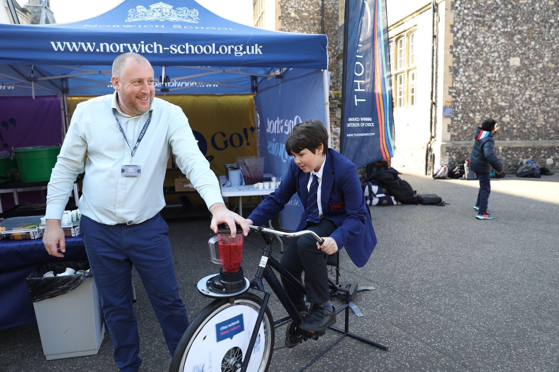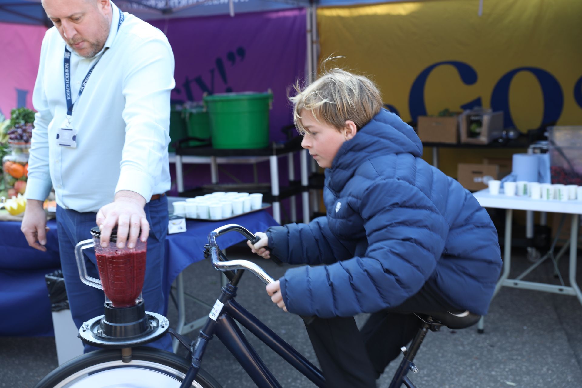 On Thursday 6 March, a team from Thomas Franks catering visited the school to promote seasonal, local, healthy eating with a smoothie pop-up on the school playground, which included a bicycle-powered blender!