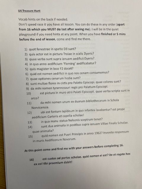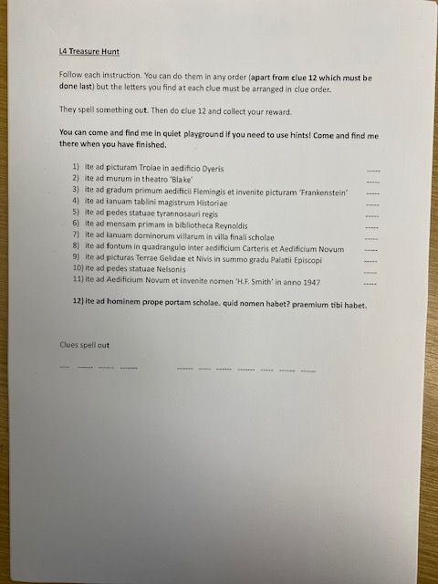 In the lead up to the summer holidays, Mrs Ward's L4-L5 have been challenged to finds the answers or letter clues to the treasure hunts. But all the clues are in Latin using vocabulary they may never have met but to try and figure out. The clues get them to look closely at details of the school they may not even have noticed. How many clues can you decipher and what answers do you know?