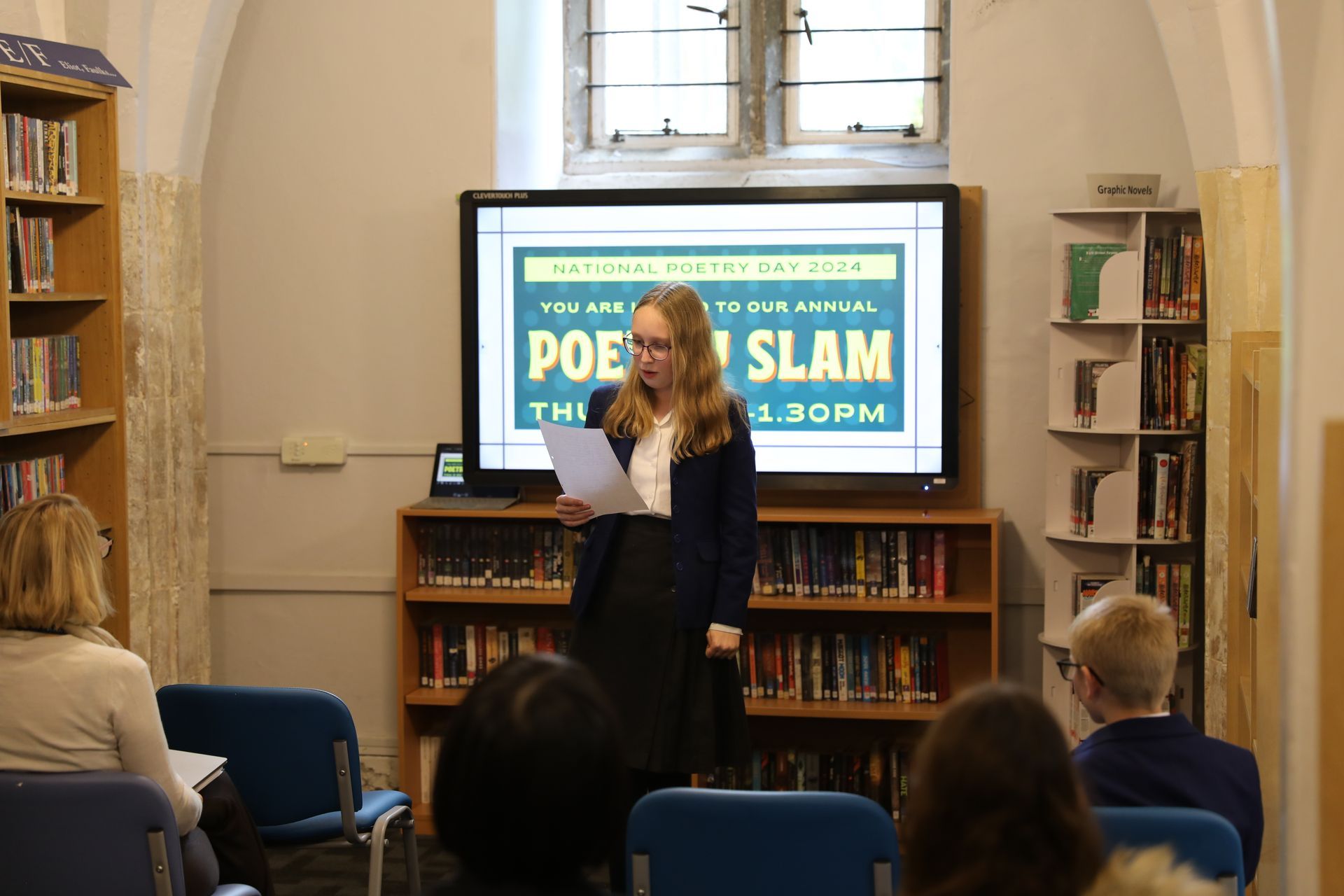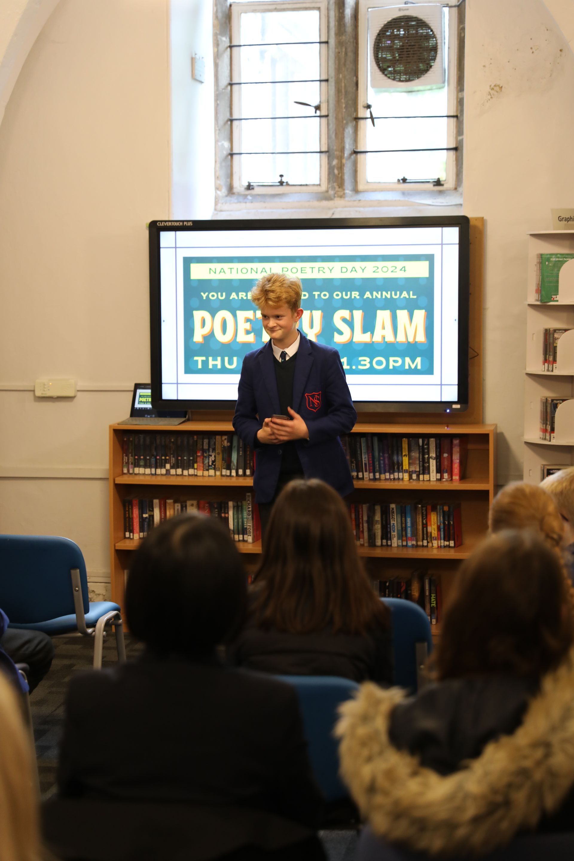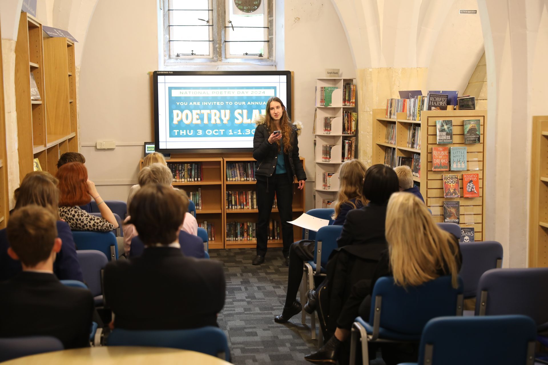 On Thursday, 3 October, Norwich School celebrated National Poetry Day with an exciting Poetry Slam hosted by the library. Pupils from all year groups came together to share the stage, reading aloud their own original works or cherished favourites. The event featured a fantastic variety of poetry, with everything from acrostics to found poems, showcasing the creativity and diversity of voices within our school. The English Department joined pupils in support, delighted to hear the talent and passion on display from their students. The poetry slam has become a treasured annual tradition, uniting our community in a celebration of poetry in all its forms.