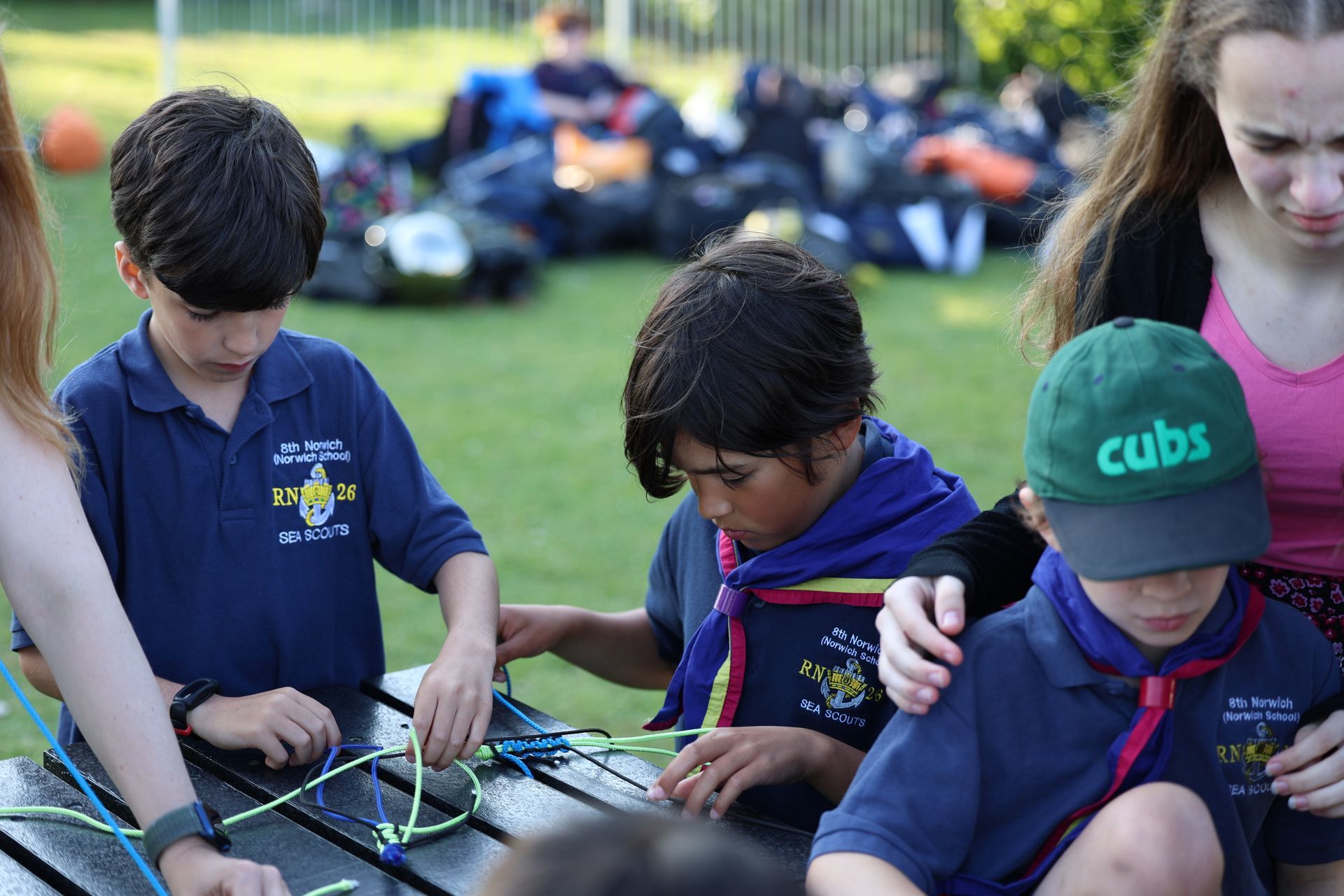 In addition to the sailing, windsurfing, kayaking, canoeing, gig pulling, SUP riding and dining shelter challenge, the cubs put up tents in preparation for their forthcoming camps and played with knots in paracord to make some amazing keyrings and bracelets.