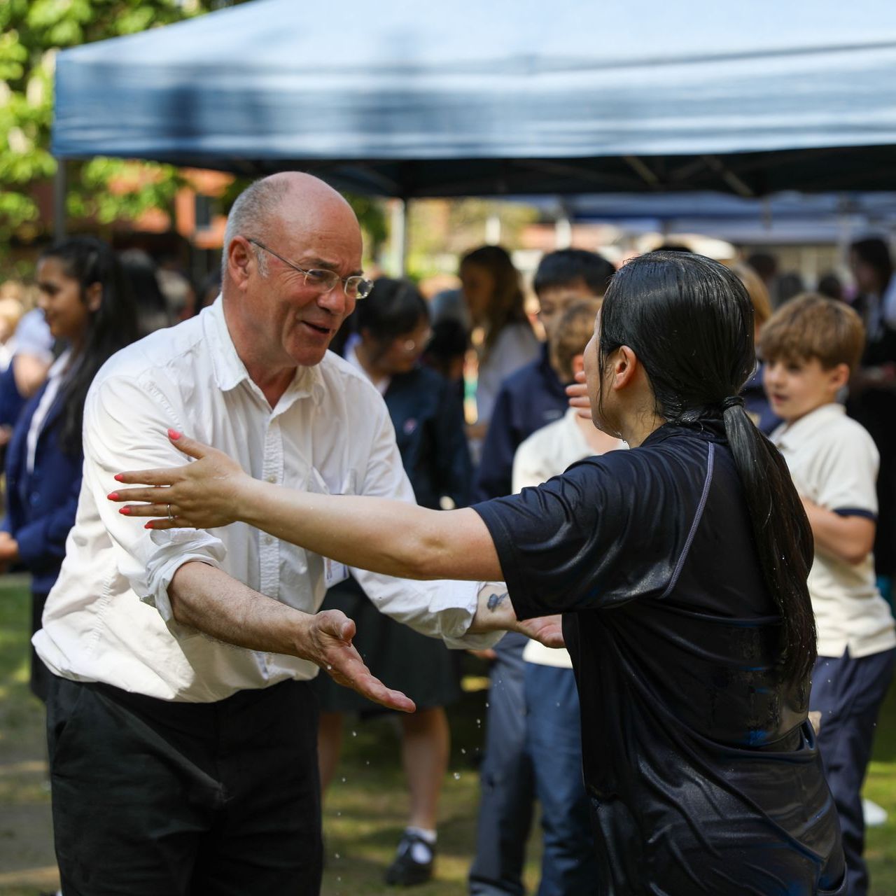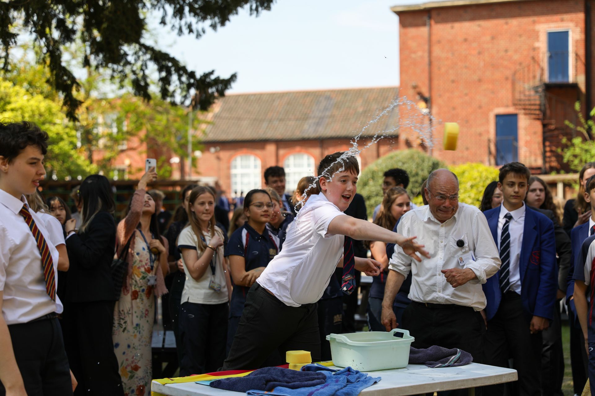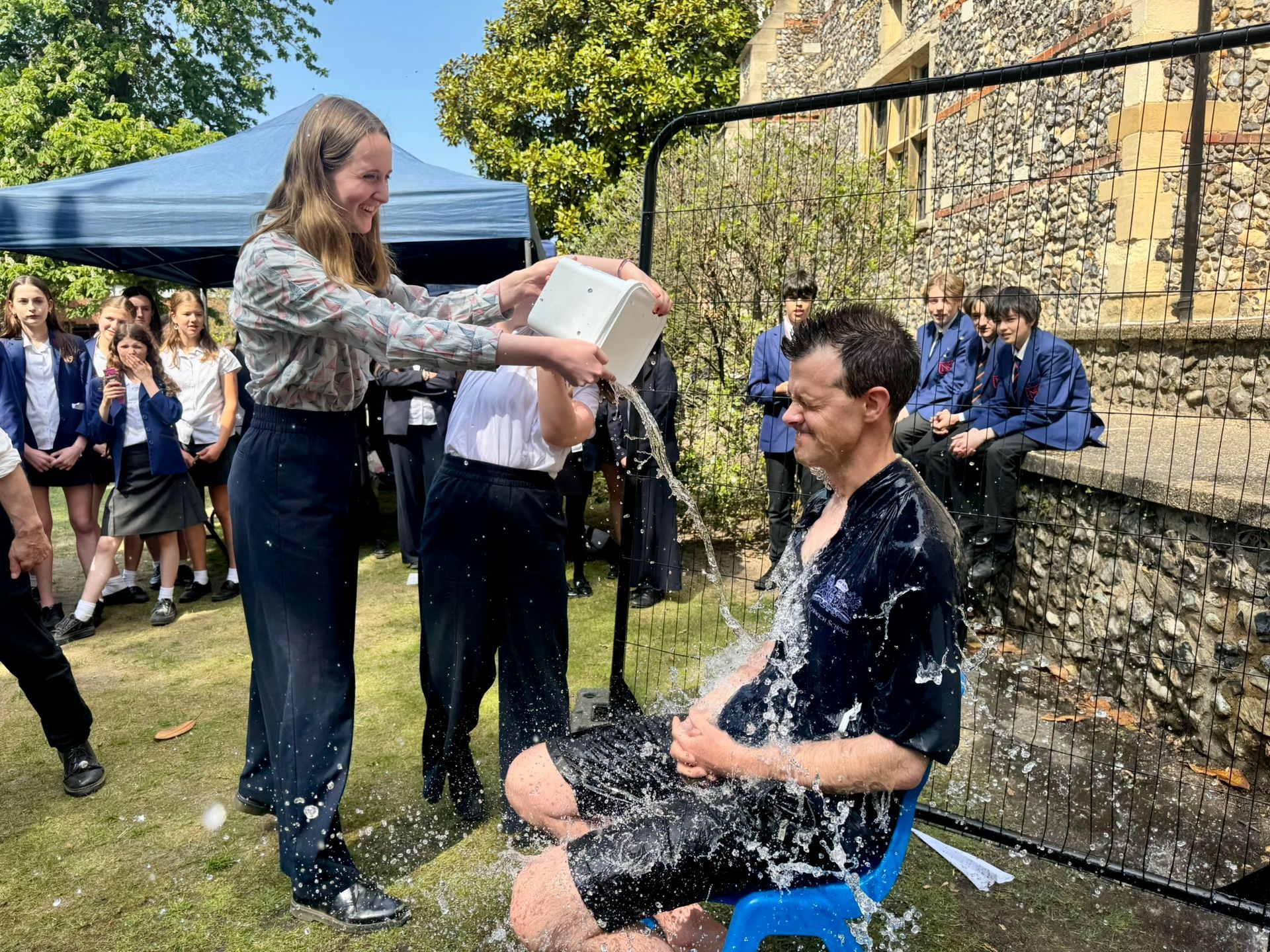 The teachers were doubly generous in their participation because they had originally expected sponges of tepid water to be thrown at them, as per the wording of the original “invitation”. However, due to the lack of accuracy of pupils using the aforementioned projectile, the decision was made to offer buckets of water instead – albeit at a far higher rate of pay/donation!