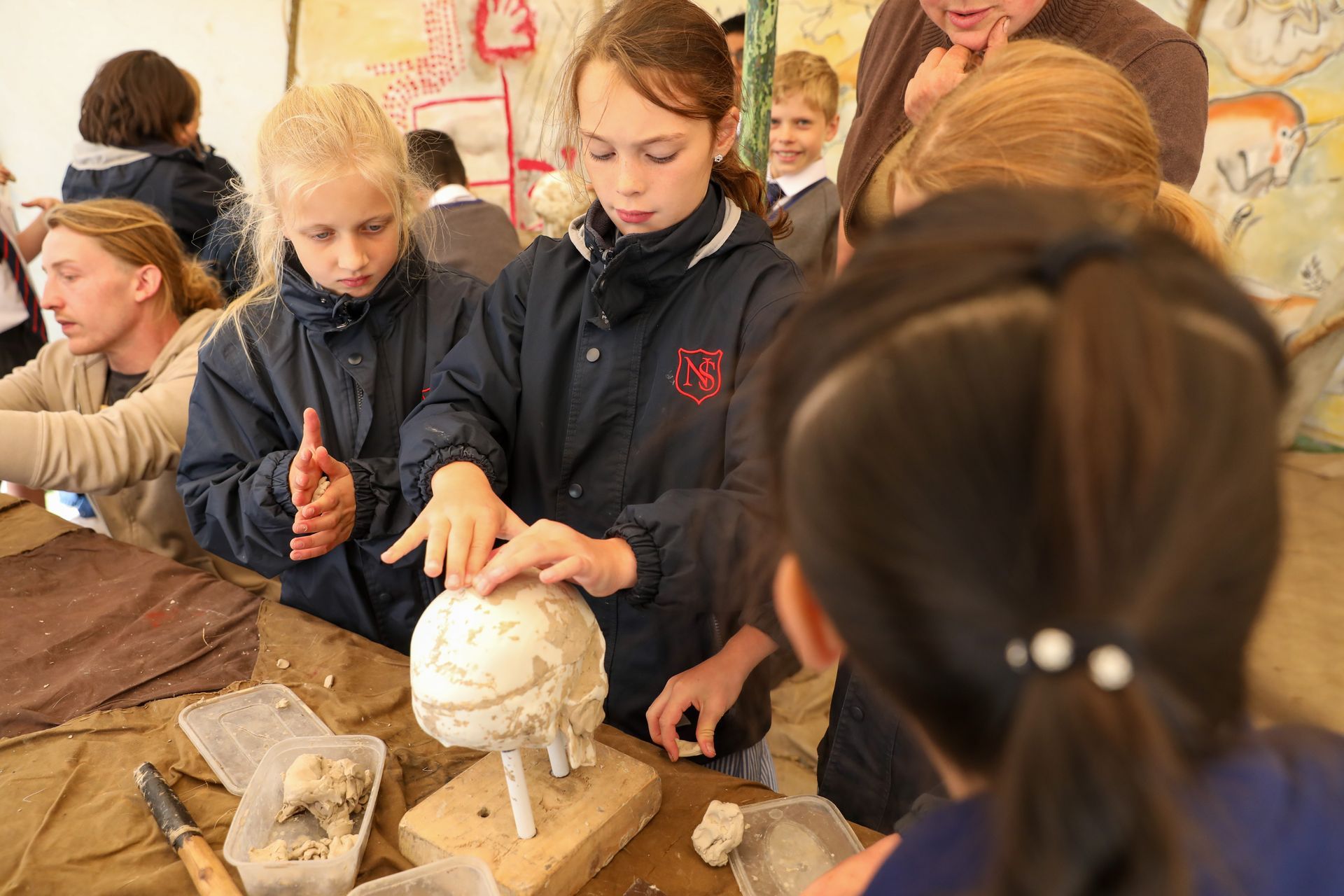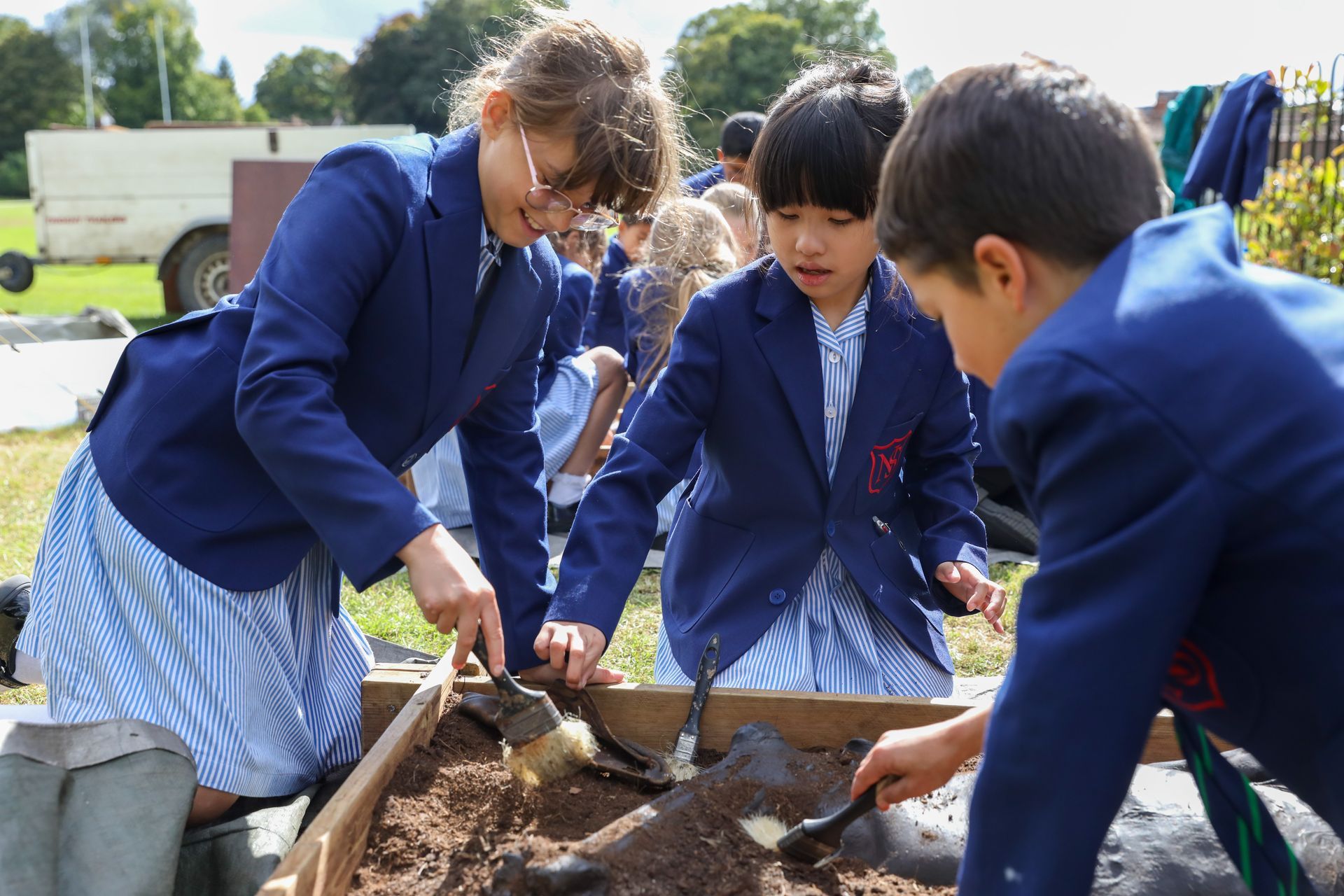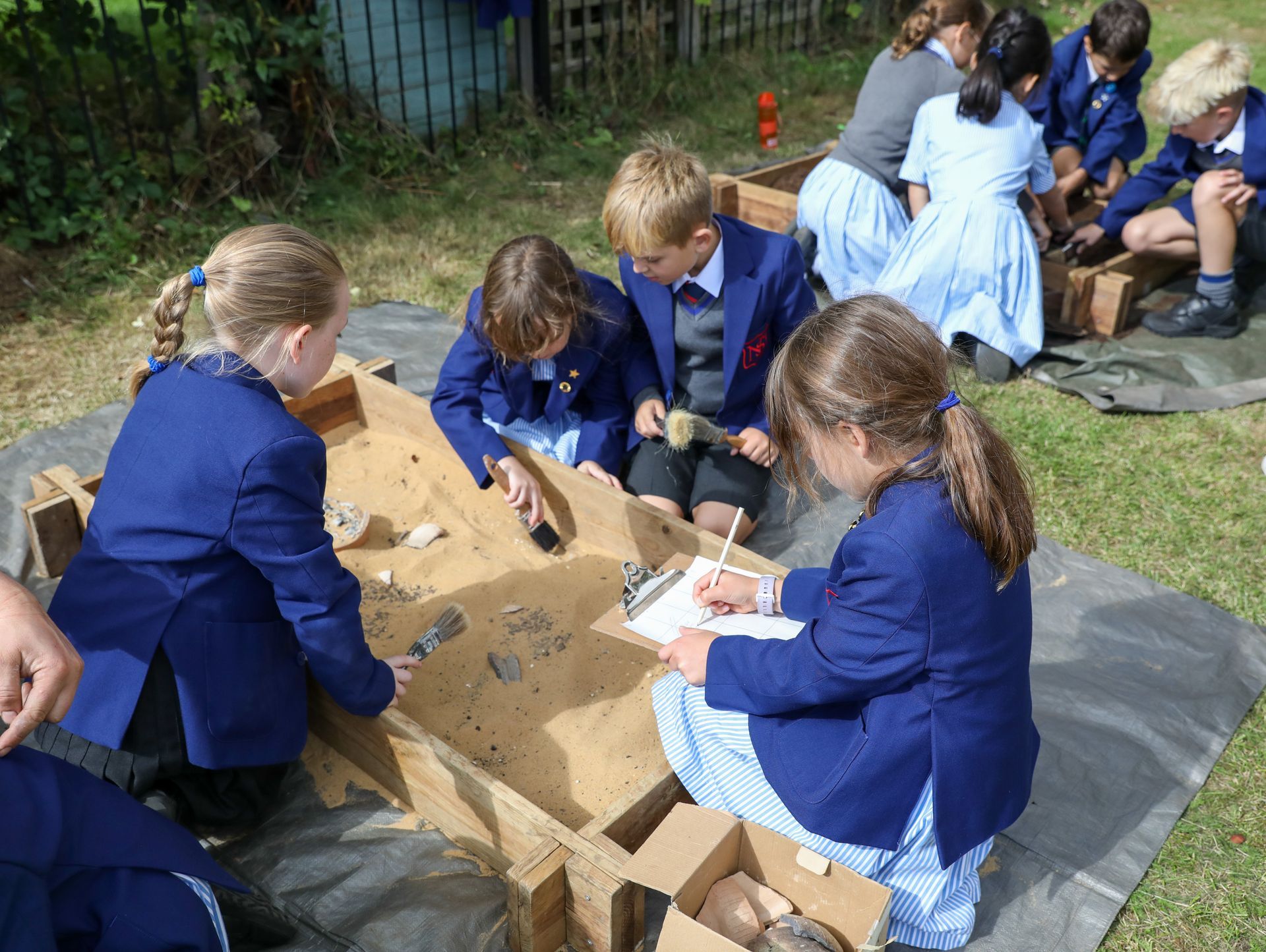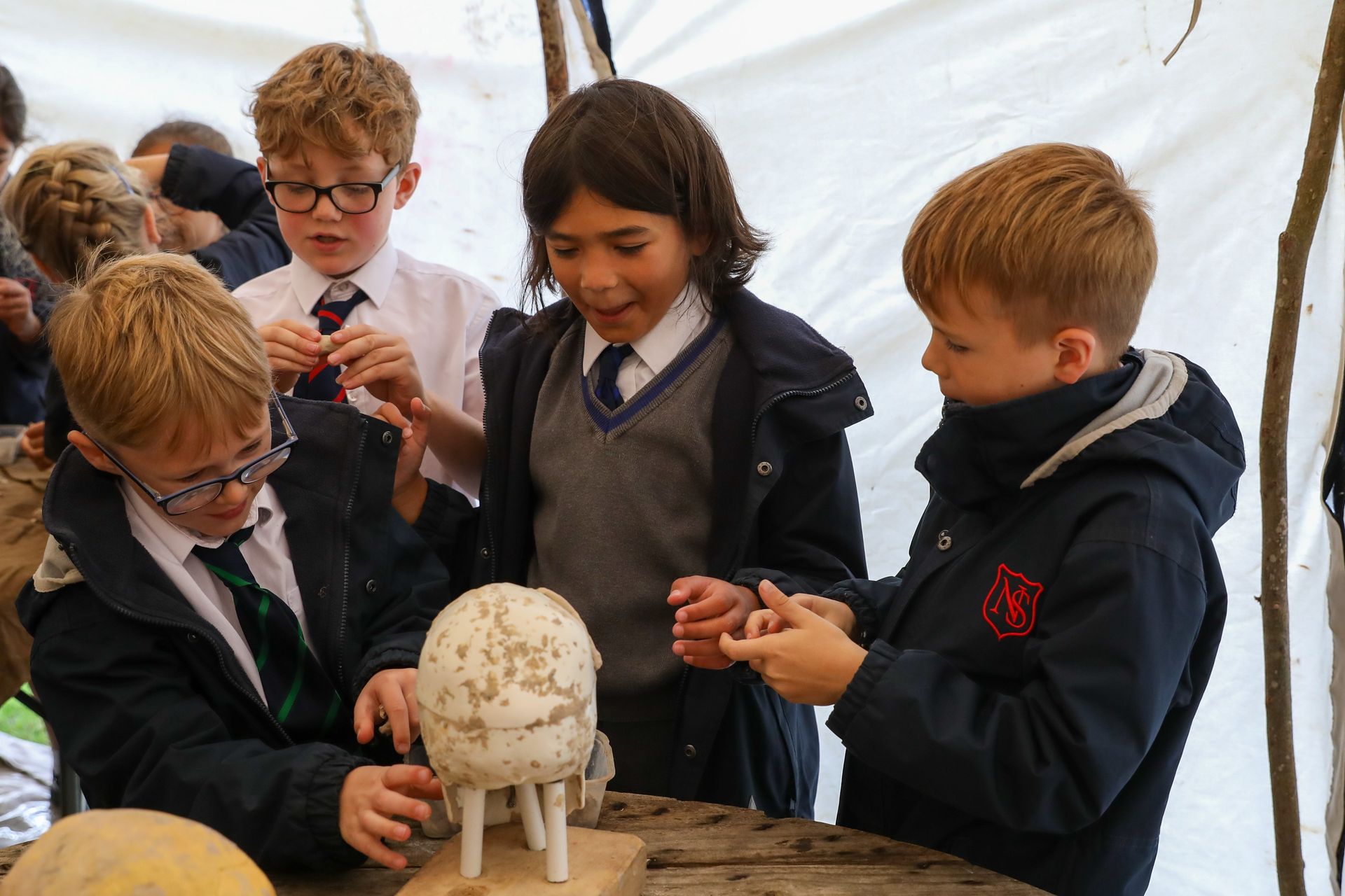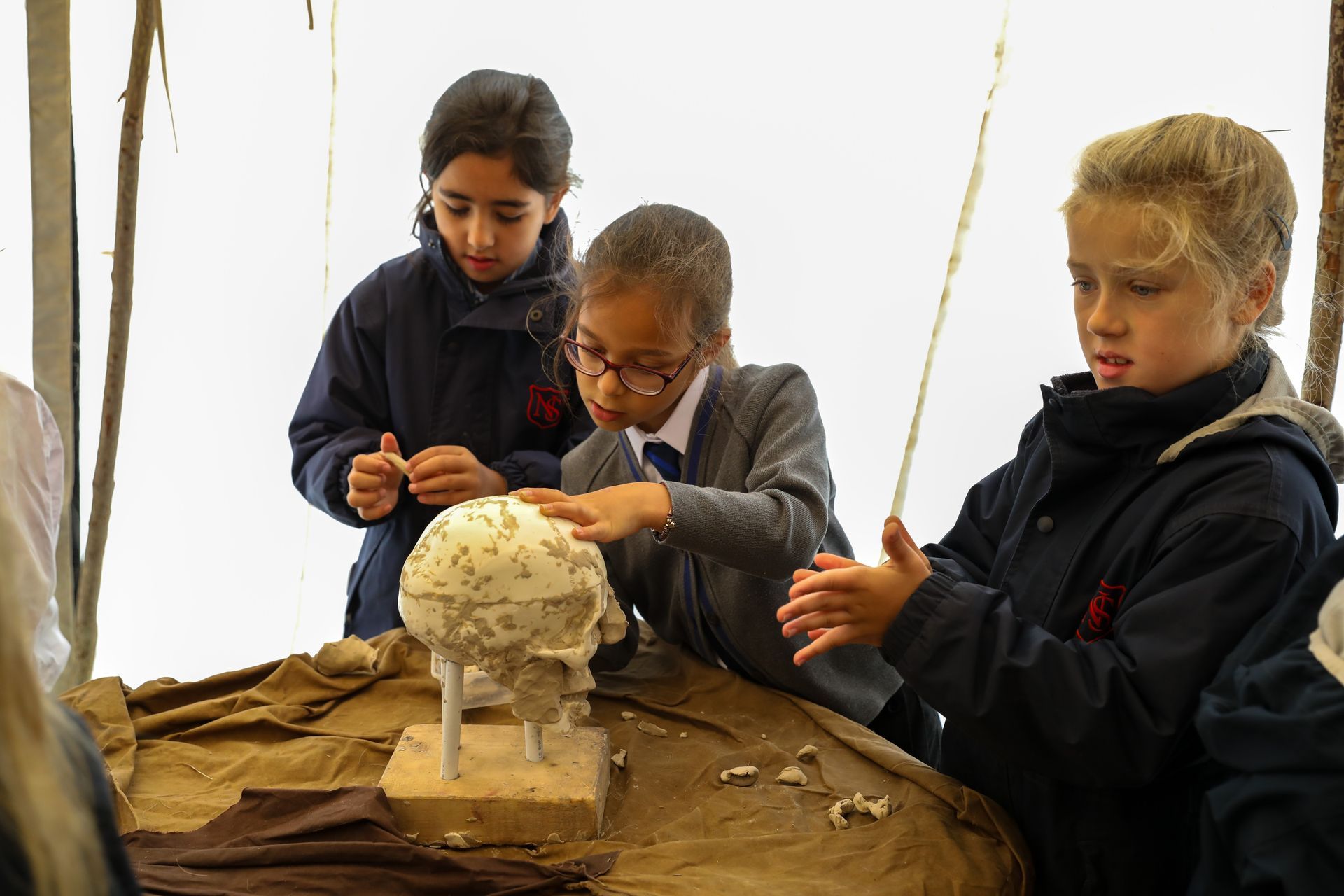 They entered the tent and were met by Memma and Kit, the resident archaeologists. Pupils were excited to share all that they have learnt about primary and secondary sources of evidence and couldn’t wait to get ‘stuck in’ to digging for evidence themselves. There were three ‘trenches’ with evidence buried under either sand or soil. After being taught how to ‘dig with brushes’ and record their findings on a grid, they began to explore the contents of their trench. It felt as though they were on real-life archaeological digs, with each group discovering clues and trying to piece together the evidence to decide what they had found. One group found a replica ‘bog body’ and delighted in coming up with theories about how the body had got there and who it was. The pupils discovered that a Roman, Tacitus, recorded that people were sacrificed and thrown into bogs in ancient Britain – so it’s likely that is what happened! Another group discovered a neolithic butchery site, with marks from someone’s knees imprinted in the ground – like a photograph! Because of this, we know that someone was kneeling down and preparing a mammoth to eat! The third group found a wide range of artefacts, including pottery and sewing materials, that they decided it must have been someone’s house as there was a round area of ground that was darker in colour – the hearth!