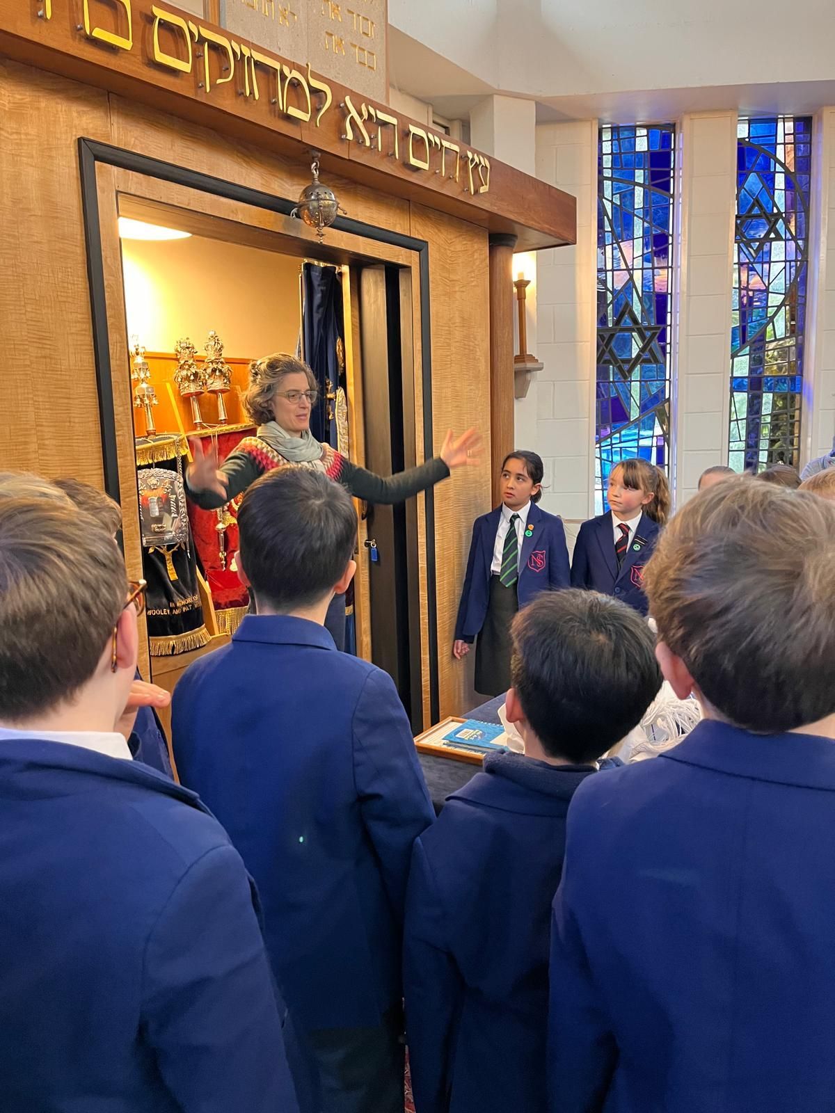Afterwards, the group moved into the main synagogue and pupils were given a sheet of things to spot as they went in. They counted the stars of David and discovered that there were five just in the stained-glass windows. Then pupils were able to try on a kippah and a tallit, or prayer shawl, experiencing firsthand some of the customs observed during prayer. A highlight of the visit was seeing the beautiful Torah scroll up close. Pupils were amazed to learn that if fully unrolled, it would be as tall as the Statue of Liberty! They also had the chance to hear a passage from the Torah being read aloud and discovered that when not in use, the scroll is carefully stored in the ark.